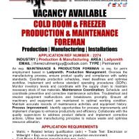 Cold Room & Freezer Maintenance & Production Foreman TRG 2274 (Ladysmith)