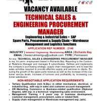 An opportunity for an experienced TECHNICAL SALES & ENGINEERING PROCUREMENT MANAGER is required for permanent employment based in Richards Bay.