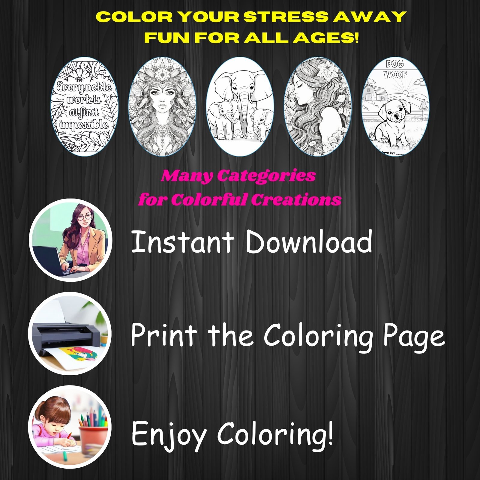 Discover endless creativity with our Coloring Book Bundle, perfect for both kids and adults! Dive into a variety of intricate designs and fun themes across many categories.