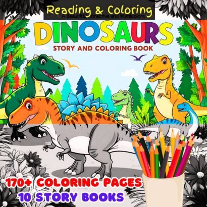 Unleash your child’s imagination with our Dinosaur Bundle! Featuring 170 pages of dinosaur coloring fun and 10 Fun and Entertaining dinosaur storybooks, this bundle offers endless entertainment and learning.