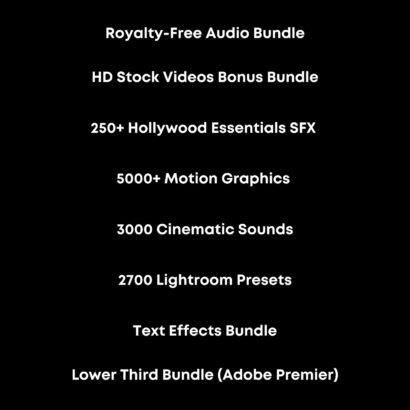 Ideal for vlogs and professional productions, this bundle includes stock photos, project files, cinematic soundtracks, and graphic resources.